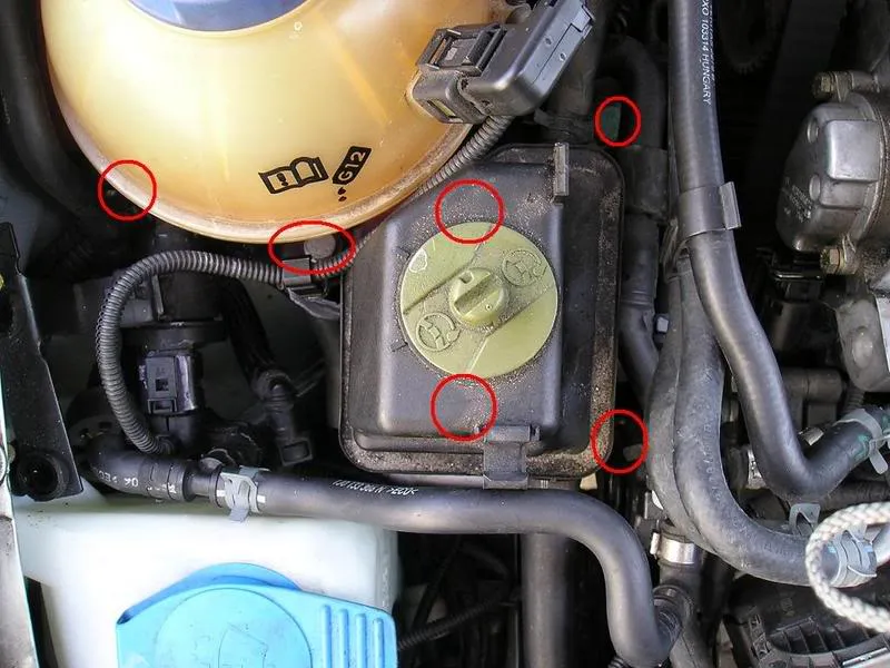 Retirez les deux vis qui maintiennent le réservoir de liquide de refroidissement ainsi que le boulon qui maintient le réservoir de direction assistée (une douille de 10 mm est nécessaire).
