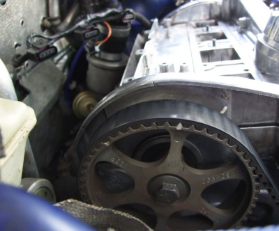 - Avec le support démonté, la vie est belle, la courroie est directement accessible. Faut-il la marquer à la peinture ? Non, mais je vais vous expliquer pourquoi c'est utile pour ceux qui ne gagnent pas leur vie en réparant des courroies de distribution VW/Audi. Le pignon (le vilebrequin) va bouger, c'est bien de savoir que le rapport vilebrequin-came est parfait. Donc, commencez par faire tourner le moteur jusqu'au PMH (alignez le repère du volant moteur et le pignon d'arbre à cames avec le couvercle de cames). Sur ma transmission intégrale, lorsque le vilebrequin était aligné avec le volant moteur, le repère de came était parfaitement aligné avec celui du couvercle, à un cran près. Est-ce nécessaire ? Pas vraiment, est-ce une bonne pratique pour le bricoleur ? Pourquoi prendre le risque ? Vous êtes là pour 10 heures, et encore quelques minutes ? Ensuite, marquez l'arbre à cames/courroie (j'ai fait deux dents espacées de plusieurs dents pour encadrer le repère sur la poulie), puis marquez la poulie/courroie de vilebrequin. - Retirez le petit galet tendeur ou retirez tout le galet tendeur. Notez que l'ancienne courroie est détendue. Sur ma transmission intégrale, le piston hydraulique était d'environ l'épaisseur d'un majeur (une main plutôt petite) (doigt entre le corps du galet tendeur et le support de galet tendeur). Retirez la courroie, marquez soigneusement la nouvelle courroie après avoir soigneusement compté ses dents ; répétez l'opération trois fois si vous l'enroulez autour de l'essieu, comme moi et ma clé anglaise. N'oubliez pas que vous jouez avec le calage du moteur ; il doit donc être correct, sinon…
