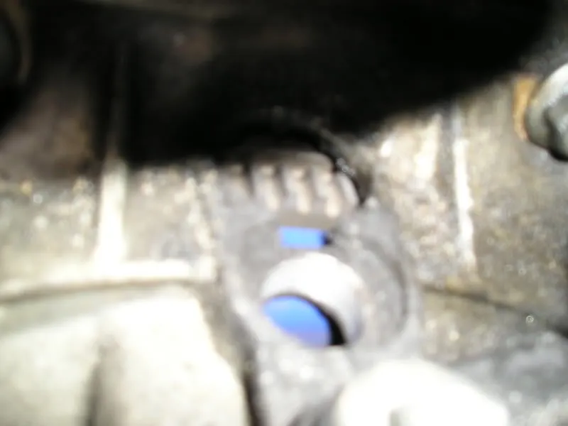 Si vous avez une transmission automatique, il n'y a pas de repère de calage sur le volant moteur. Transmission manuelle uniquement. Si c'est une transmission manuelle, il y a un bouchon en caoutchouc noir sur le dessus, à l'endroit où le carter d'embrayage rejoint le bloc moteur. Retirez ce bouchon et vous verrez les dents de la couronne de démarreur. Utilisez une lampe de poche : il y a un petit triangle au-dessus de la couronne. Ce triangle correspond à un petit triangle entaillé dans la couronne, juste en dessous des dents. Lorsque ces deux repères sont alignés, le cylindre n° 1 est au PMH, et les repères de calage de la poulie de courroie d'entraînement et du carter de courroie trapézoïdale sont également alignés (autre extrémité du vilebrequin, avant du moteur). J'ai l'impression que le repère du volant moteur est un peu plus précis, car sa circonférence est beaucoup plus grande.